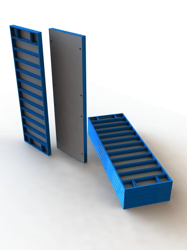 Pour une rapidité et des ouvrages plus demandeurs (resistant à une pression de 10T/m2): grandes hauteurs, productivité accrue, rotation rapide, qualité plus élevée, rendu plus uniforme... nous avons avec notre partenaire développé une banche métallique répondant à tous les critères et compatible à nos panneaux modulaire en aluminium/acier pour accroitre sa modularité et polyvalence :